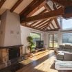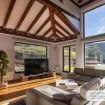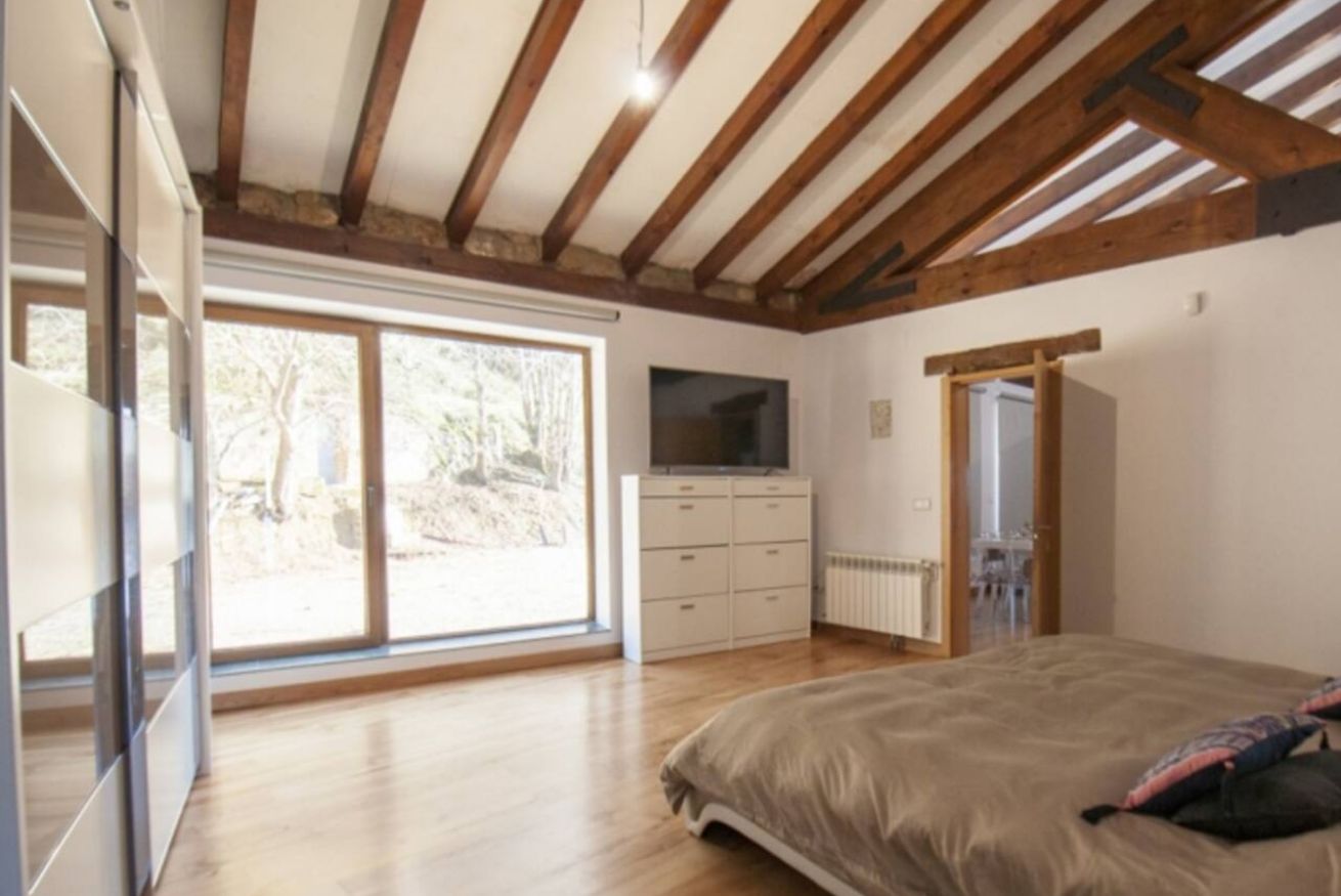 El interior de la casa es luminoso con grandes ventanales que permite ver las montañas desde el interior a la vez que se disfruta de intimidad. Es un gran espacio diáfano con sala de estar con cocina integrada, comedor, chimenea y un apartado con tres camas individuales.