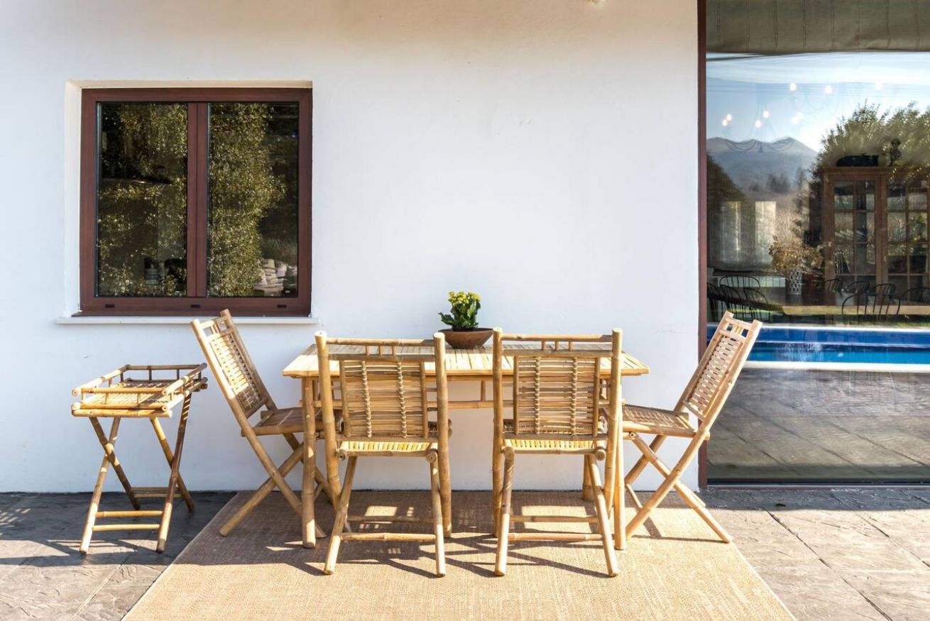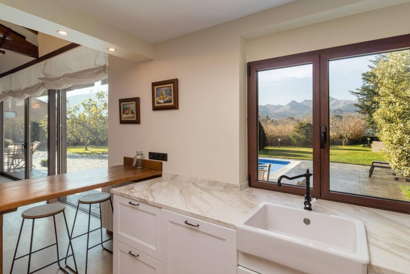 La villa ofrece impresionantes vistas a las montañas circundantes. Los huéspedes pueden disfrutar de las vistas panorámicas mientras se relajan en el jardín o toman el sol junto a la piscina. El jardín también ofrece un espacio perfecto para relajarse al aire libre, ya sea para disfrutar de una barbacoa con amigos y familiares o para leer un libro en una de las tumbonas.